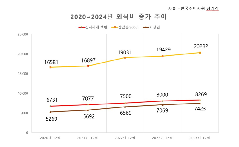 한국소비자원 참가격에 따르면 지난 5년간 외식비는 무섭게 오르는 추세다. 한국인의 대표적인 식사 메뉴인 김치찌개 백반의 경우 2020년 12월 기준 6731원이었지만 2024년 12월에는 8269원으로 가격이 22.85% 상승했다. 삼겹살(200g 기준) 역시 2020년 12월 기준 16581원에서 2024년 12월 기준 20282원으로 가격이 22.32% 올랐다.