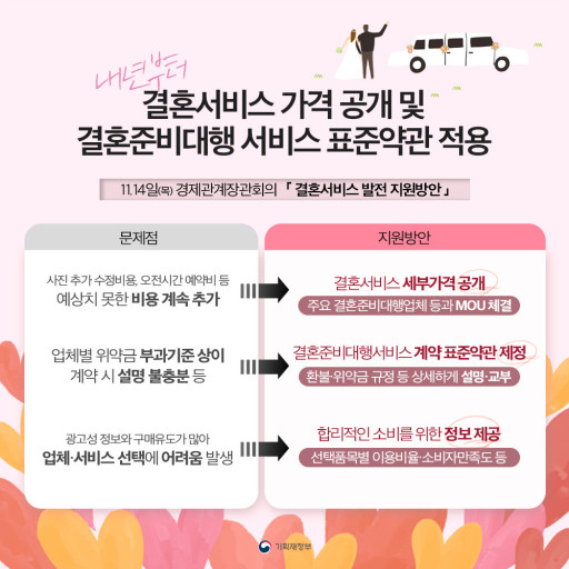 정부에서도 웨딩업계의 불공정한 거래 관행이 고질적인 문제로 떠오른다는 사실을 인지하고 관련 정책들을 개선해 가고 있다. 올해 상반기부터 결혼준비대행업 분야 표준약관을 시행하고, 결혼 준비 시 참고할 수 있도록 소비자 피해 예방 가이드라인을 제작·보급한다.
