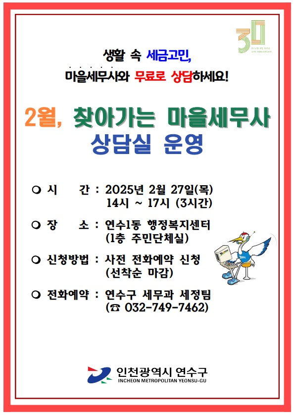 2월 상담은 27일 오후 2시부터 5시까지 연수1동 행정복지센터에서 진행되며, 박기영 세무사가 국세 및 지방세 관련 상담을 제공합니다.