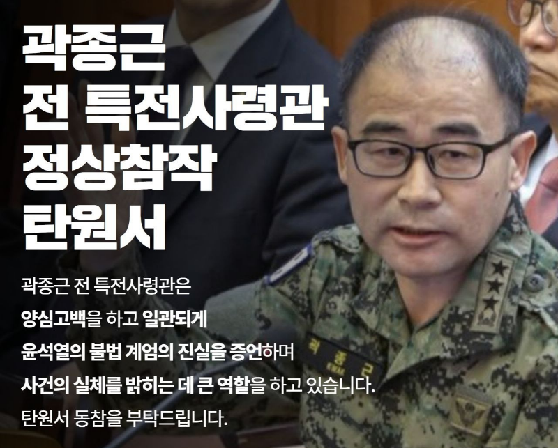 이어 단체는 “곽 전사령관도 계엄 사전 준비에 깊이 개입한 정황이 드러나 처벌을 피할 수는 없을 것이지만, 양심고백을 하고 불법 계엄의 진실을 성실히 증언하며 사건의 실체를 밝히는 데 큰 역할을 하고 있다”며 “사건의 전모를 밝히는 데 성실하게 협조하고 국민에게 눈물로 사죄하고 있는 곽 전사령관에 대해서는 정상참작이 필요하다”고 탄원 캠페인에 나선 취지를 밝혔다.