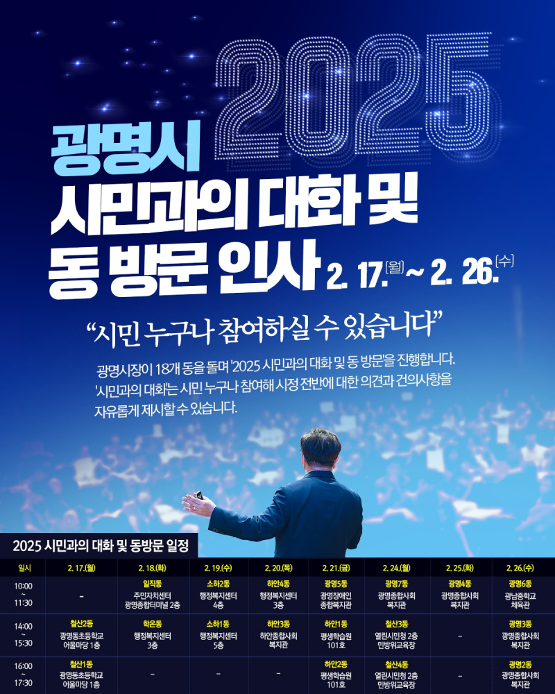 한편, 구체적인 방문 일정은 ▲17일 오후 2시 철산2동, 오후 4시 철산1동 ▲18일 오전 10시 일직동, 오후 2시 학온동 ▲19일 오전 10시 소하2동, 오후 2시 소하1동 ▲20일 오전 10시 하안4동, 오후 2시 하안3동 ▲21일 오전 10시 광명5동, 오후 2시 하안1동, 오후 4시 하안2동 ▲24일 오전 10시 광명7동, 오후 2시 철산3동, 오후 4시 철산4동 ▲25일 오전 10시 광명4동 ▲26일 오전 10시 광명6동, 오후 2시 광명3동, 오후 4시 광명2동입니다. /hursunny1015@sedaily.com