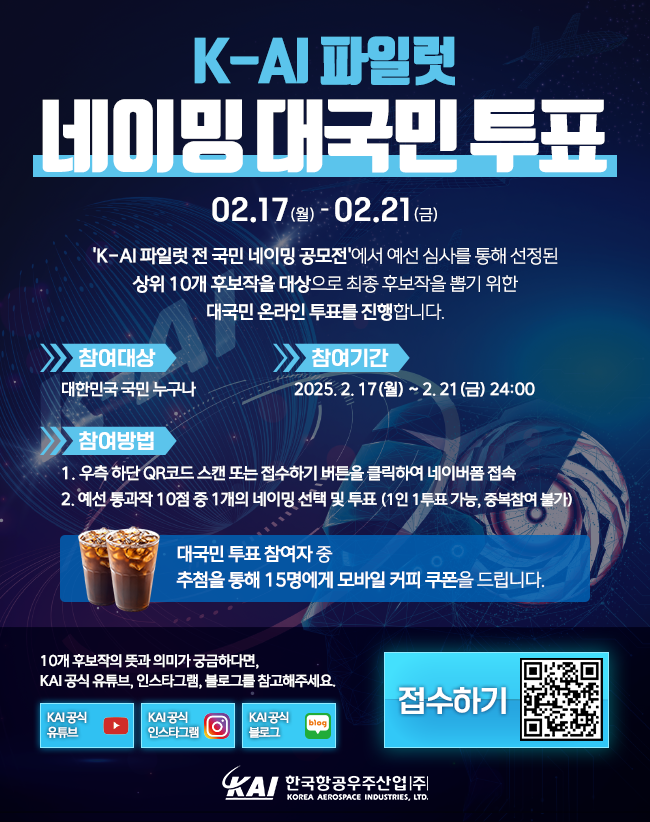 온라인 대국민 투표는 17일부터 21일까지 5일간 진행되며 투표 페이지를 통해 참여할 수 있다. 후보작에 대한 명칭과 의미, 응모자에 대한 정보는 KAI 공식 SNS 채널을 통해 확인이 가능하다.