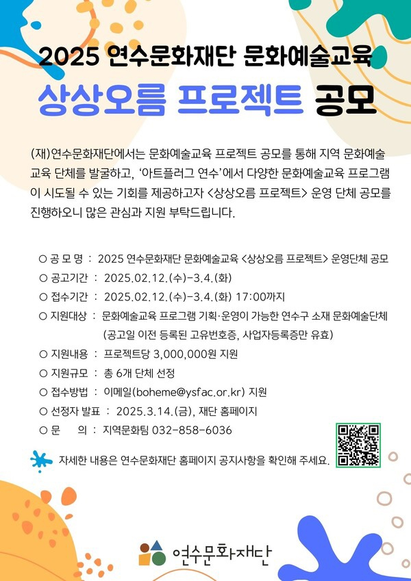 [서울경제TV 인천=김혜준 기자] 인천 연수문화재단이 2025 문화예술교육 ‘상상오름 프로젝트’ 운영단체 공모를 진행합니다.