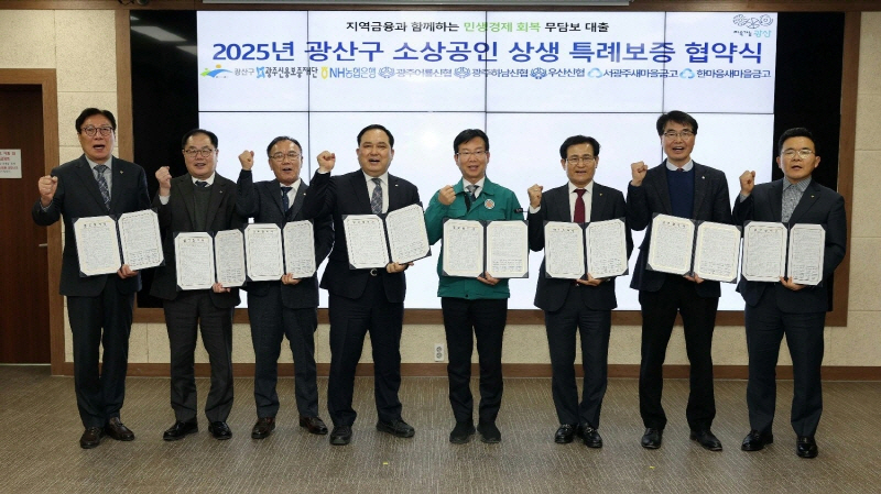 광산구는 17일 광주신용보증재단, 농협은행, 광주어룡신협, 광주하남신협, 우산신협, 서광주새마을금고, 한마을새마을금고와 소상공인 상생 특례보증 업무협약(MOU)을 체결했다.