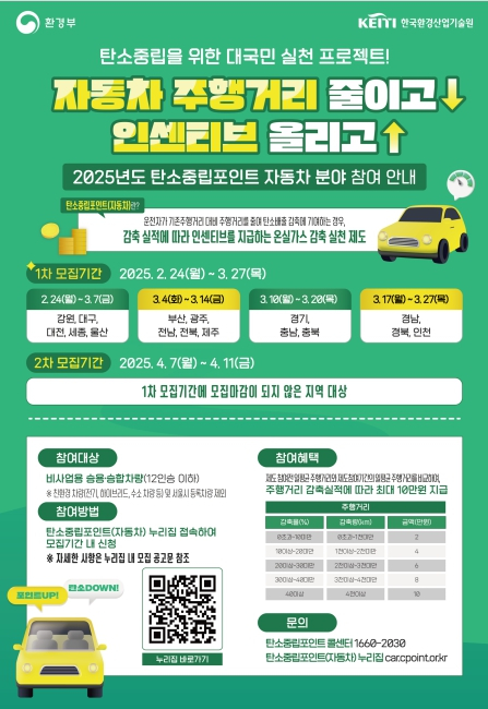 자동차 탄소중립포인트제는 주행거리 감축 실적에 따라 인센티브를 제공하는 제도이다. 친환경 차량을 제외한 비사업용 12인승 이하 승용·승합차량 대상이며, 속초시에서는 2025년에 총 147대를 모집한다. 자동차의 경우 2월 24일부터 3월 7일까지 선착순으로 모집하며 자동차 탄소중립포인트제 누리집을 통해 신청한 후 증빙자료를 제출해야 한다. 인센티브는 감축 실적에 따라 최소 2만 원에서 최대 10만 원까지 지급된다.