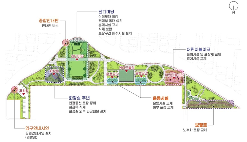 특히 잔디마당에는 새로운 야외무대와 쉼터를 조성하고, 운동 공간 기구와 휴게시설도 교체합니다. 어린이놀이터에는 새 놀이기구를 설치하고 보호자 휴게 공간을 마련합니다. 또한, 충현초·고 학생들의 통학길을 개선하고 수목을 심어 자연 친화적 환경을 조성할 계획입니다.