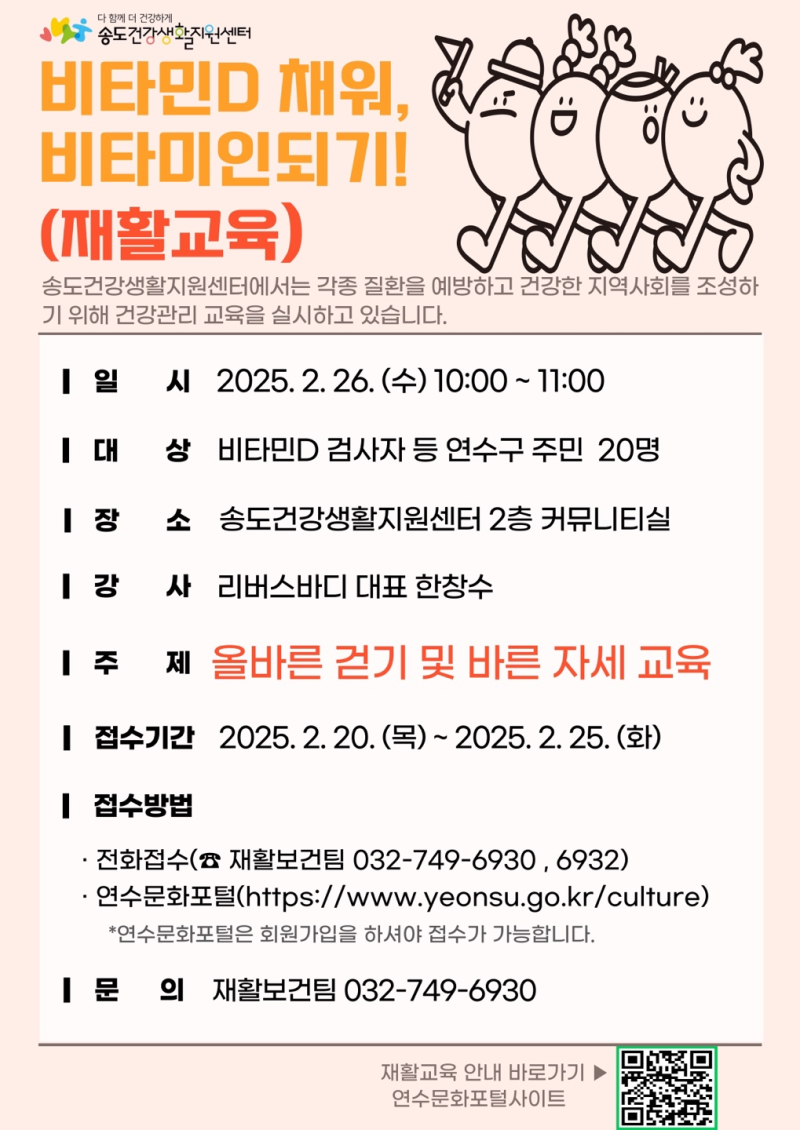 또한 건강강좌, 재활운동, 운동 교육, 영양식 제공 등으로 구성되어, 26일에는 ‘올바른 걷기 및 바른 자세 교육’을 주제로 재활운동 강좌가 열릴 예정입니다. 참가자는 25일까지 연수구보건소 누리집 또는 전화로 선착순 접수 가능합니다.
