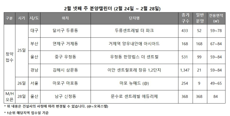 2월 넷째 주에는 서울 마포구 '마포 뉴매드'(9실, 오피스텔)가 청약 접수를 앞두고 있다. 지방에서는 광역시에 신규 물량이 집중돼 있다. 대구 달서구 '두류센트레빌 더 파크'(52가구), 부산 연제구 '거제역 양우내안애 아시아드'(168가구), 울산 중구 '우정동 한양립스 더 센트럴'(99가구)이 청약을 받는다. 또 경남 김해시 '이안 센트럴포레 장유 1,2단지'(21가구)가 청약을 진행한다.