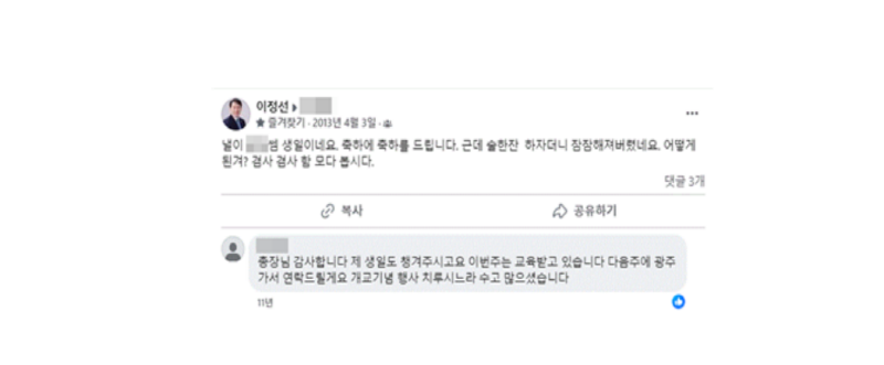 시민모임은 이러한 주장을 뒷받침하기 위해 2013년 A씨가 자신의 페이스북 계정에서 이정선 교육감과 대화를 주고 받은 대화를 공개했다,