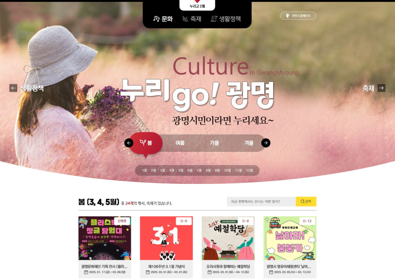 플랫폼은 ▲문화 ▲축제 ▲생활정책 3개 카테고리로 나뉘며, 문화·축제 카테고리에서는 계절별·월별 행사 일정을 제공해 시민들이 공연, 축제, 포럼 등 다양한 행사를 한눈에 확인할 수 있습니다. 생활 정책 카테고리에서는 광명시 운영 시설 정보, 연령별 맞춤 혜택, 지원 정책 등을 공간별·대상별·주제별로 정리해 편리하게 이용할 수 있습니다.