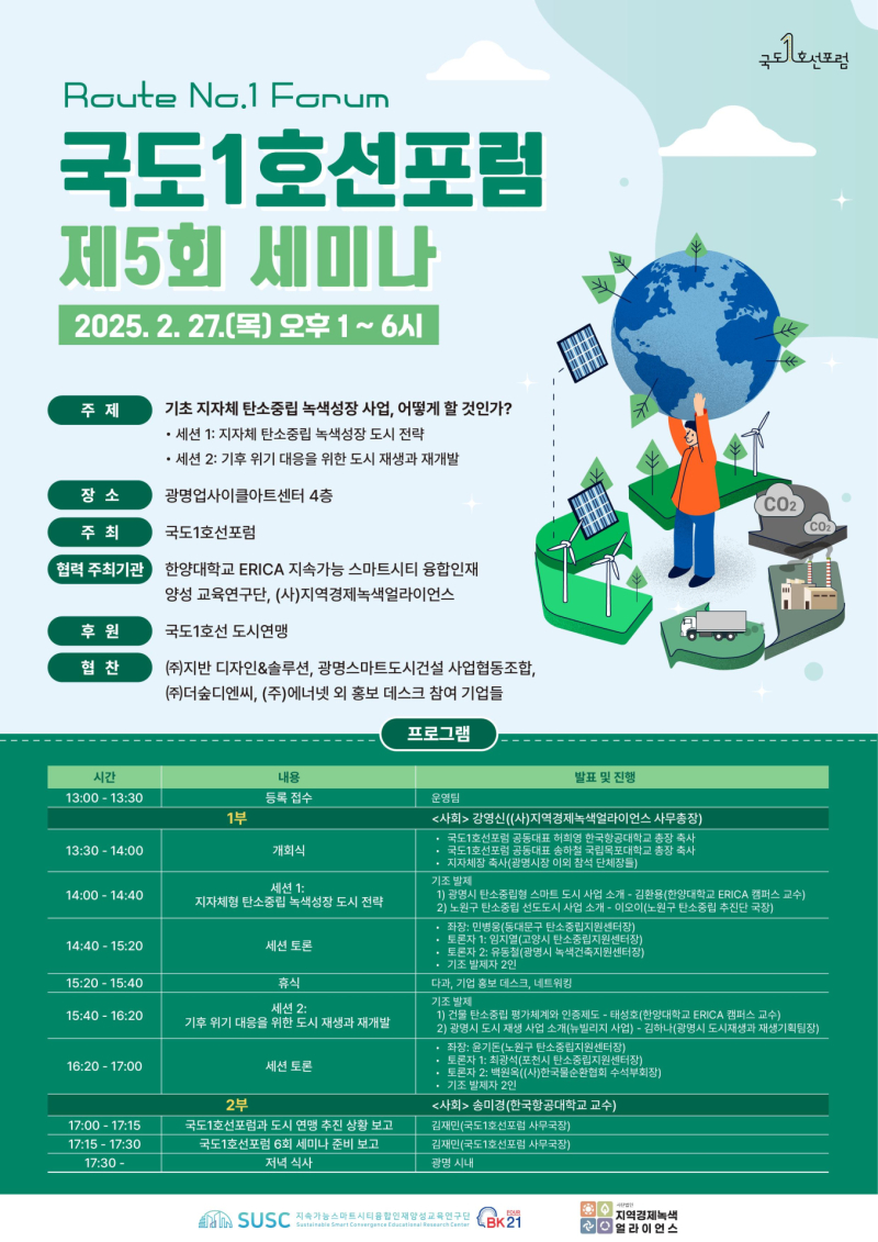 24일 시에 따르면, 오는 27일 광명업사이클아트센터에서 열리는 이번 세미나는 국도1호선포럼, 한양대학교 ERICA 지속가능 스마트시티 융합인재 양성 교육연구단, (사)지역경제녹색얼라이언스가 협력해 기후 위기 대응과 탄소중립 정책 방향을 논의합니다. 후원 기관인 ‘국도1호선 도시연맹’은 국도1호선을 따라 위치한 지자체 간 경제 협력을 도모하는 연합체로, 현재 경기 고양시, 광명시, 오산시, 전남 목포시 등 7개 시·군·구가 참여하고 있습니다.