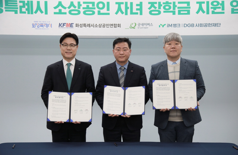 [서울경제TV=김수윤 인턴기자] DGB금융그룹 DGB사회공헌재단은 화성특례시소상공인연합회 및 굿네이버스 경기남부사업본부와 함께 ‘화성특례시 소상공인 자녀 장학금 지원을 위한 업무협약’을 체결하고 후원금을 전달했다고 25일 밝혔다.