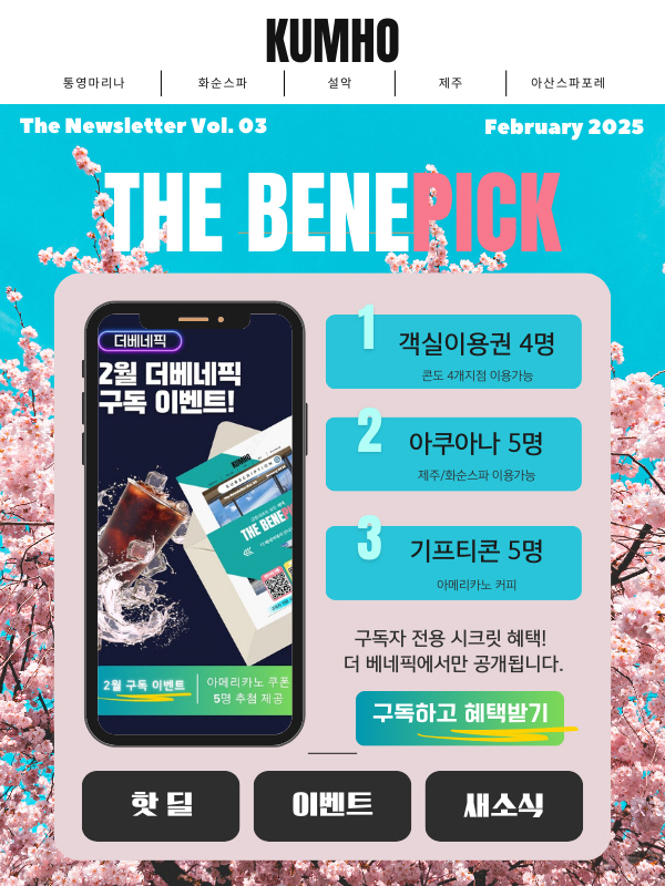 이 외에도 금호리조트는 월간 뉴스레터 ‘더베네픽(The BenePick)’을 통해 고객 커뮤니케이션을 확대하고 있다. 지난 12월부터 발행되고 있는 ‘더베네픽’은 핫딜 특가, 부대시설 프로모션 등 다양한 이벤트와 금호리조트 주요 소식들을 전하고 있으며, 추후 ‘더베네픽’ 구독자 전용 부대시설 할인 혜택을 제공할 계획이다.