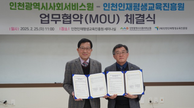 [서울경제TV 인천=김혜준 기자] 인천시사회서비스원과 인천인재평생교육진흥원이 업무협약을 체결했습니다.