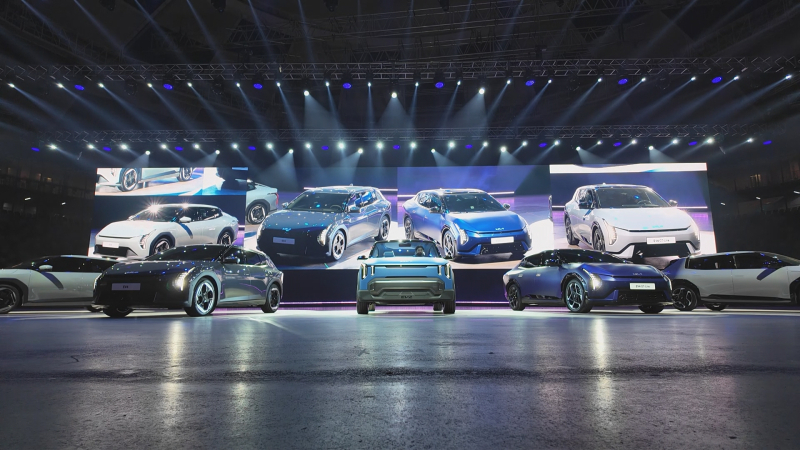 기아의 PV5와 EV4, EV2 콘셉트 모델 등 전기차들이 화려한 조명을 받으며 무대 중앙으로 모여듭니다.