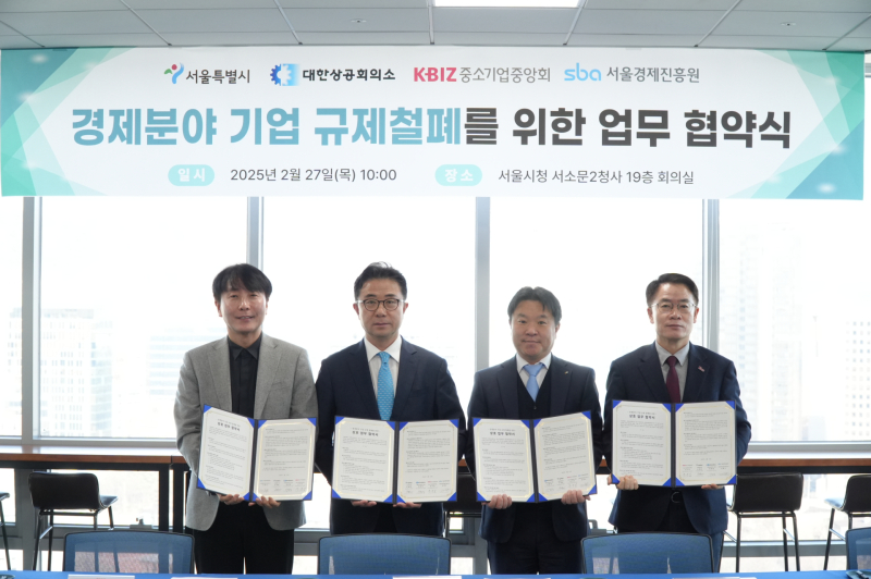 이날 협약식에는 추문갑 중기중앙회 경제정책본부장을 비롯해 주용태 서울시 경제실장, 이종명 대한상의 산업혁신본부장, 김현우 SBA 대표이사 등이 참석했으며, 4개 기관은 업무협약을 통해 서울시 소재 기업들의 혁신과 성장을 저해하는 불합리한 규제를 공동으로 발굴해 신속히 개선하는 데 중점을 두고 공동 협력체계를 구축하기로 했다.