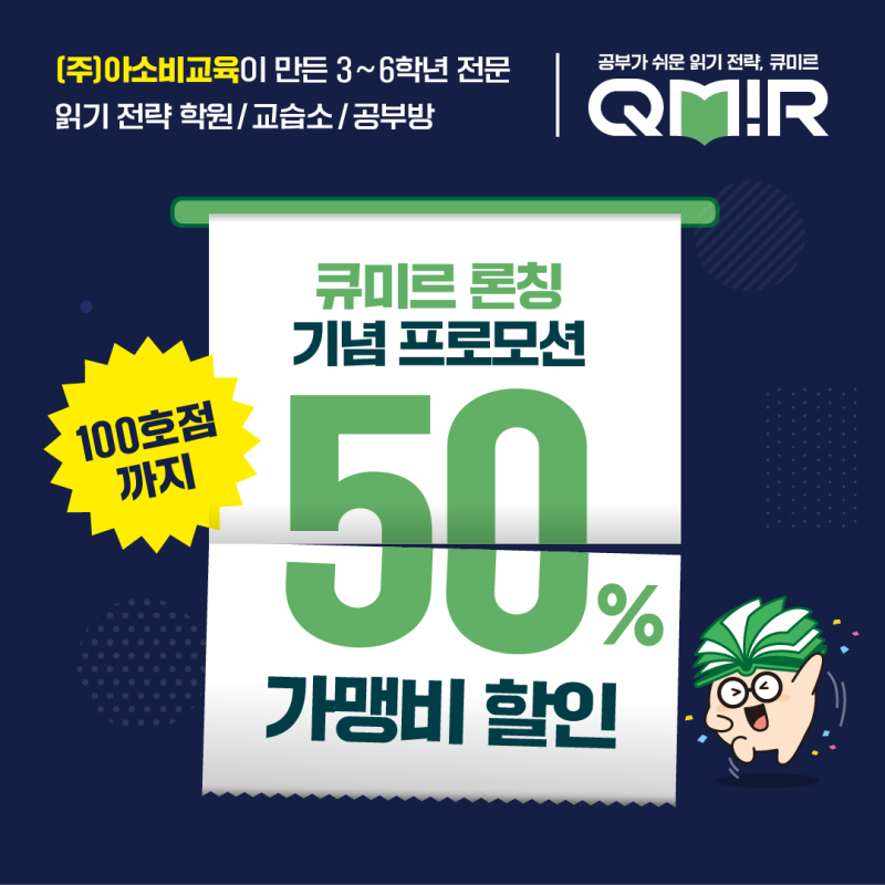 이번 가맹 프로모션은 큐미르의 신규 론칭을 기념해 2월 1일부터 100호점 계약 마감 시까지 진행되는 특별 프로모션으로 기간 내 최초 계약을 체결하는 경우 가맹비 50% 할인, 큐미르 가맹 시 아소비 가맹비 면제 등 파격적인 혜택이 제공되며, 신규 가맹 원장 1명을 추첨해 최신 휴대폰을 증정하는 추첨 이벤트와 소문내기 이벤트도 진행된다.