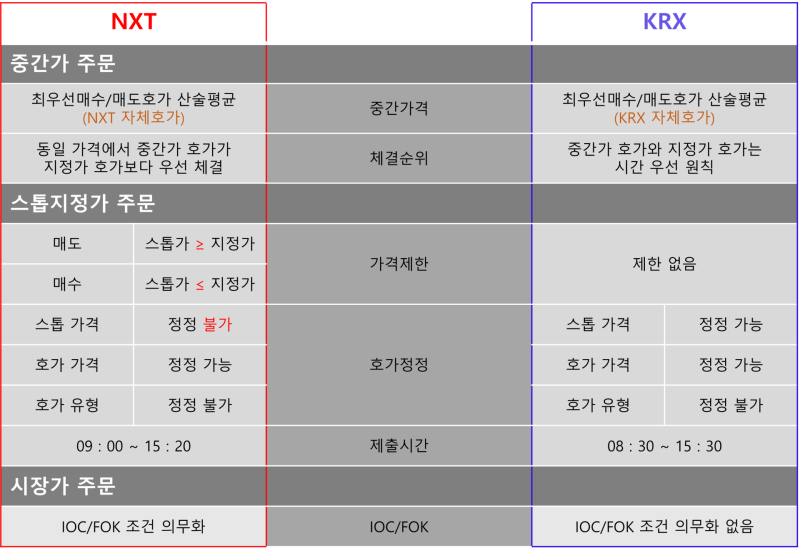NXT 시장과 KRX 시장의 가장 큰 차이는 ‘거래시간’에 있다. NXT는 기존 KRX 정규 거래 시간(09:00~15:30)과 더불어, 프리마켓(08:00~08:50)과 메인마켓(09:00:30~15:20), 애프터마켓(15:40~20:00)을 운영해 최대 12시간까지 거래가 가능하다. 단, 프리마켓과 애프터마켓에서는 가격 급변을 방지하기 위해 지정가 호가만 허용한다.