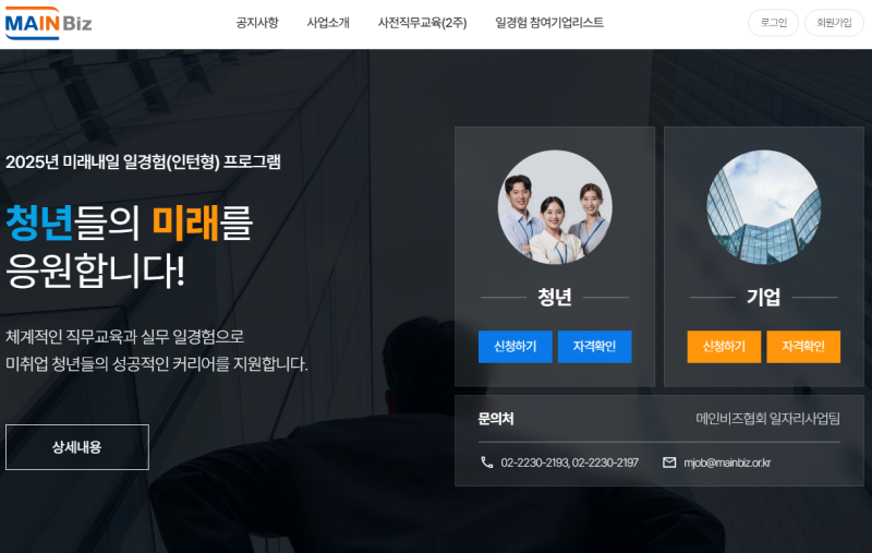메인비즈협회는 서울, 경기, 인천, 부산, 대구, 광주 등 전국적으로 상시 모집하며 경영·사무, 광고·마케팅, IT 분야에서 사전직무교육을 시행한 후 8주(최대 12주)간 일경험을 지원한다.