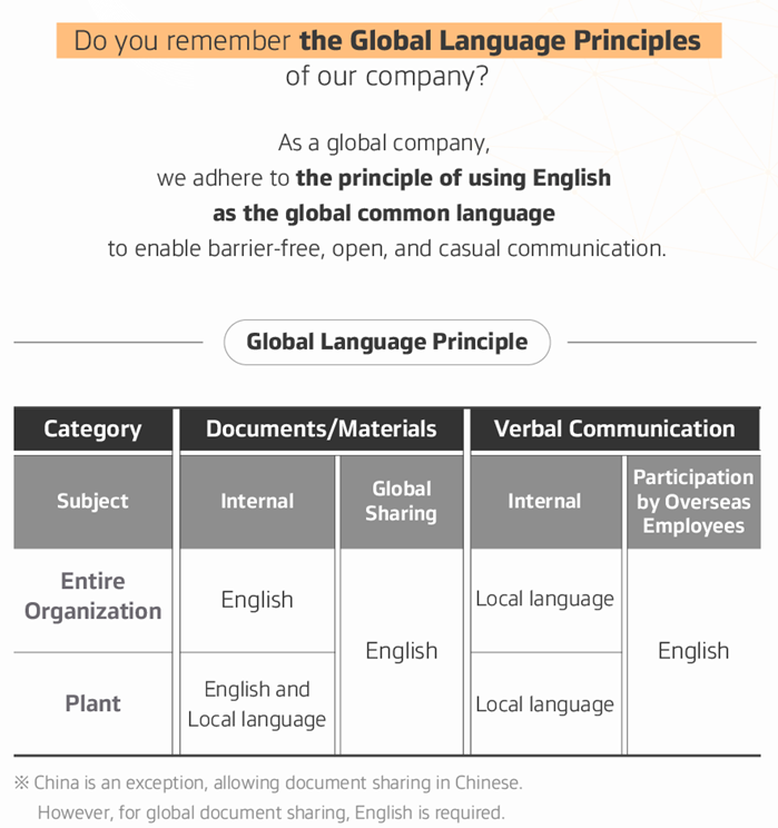 원칙 적용의 현실성·합목적성을 고려해 △현지공장 생산 기능직은 영어·현지어 병용 △발표·협의 등 발화·일상 언어는 현지어 자율사용 △정부기관 등 대외용 자료, 법적 이슈 자료 제외 △해외직원 참여 회의시 사업장·공장 모두 영어 사용 등의 기준도 함께 제시됐다.