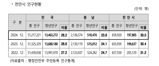 천안시내의 청년인구는 197,805명으로, 전체 시 인구의 30퍼센트에 달하는것으로 나타나 천안시는 25년 천안시 청년정책 추진방향을 ‘청년이 고민하고 천안시가 구현하는 청년 친화도시’라고 밝혔습니다.