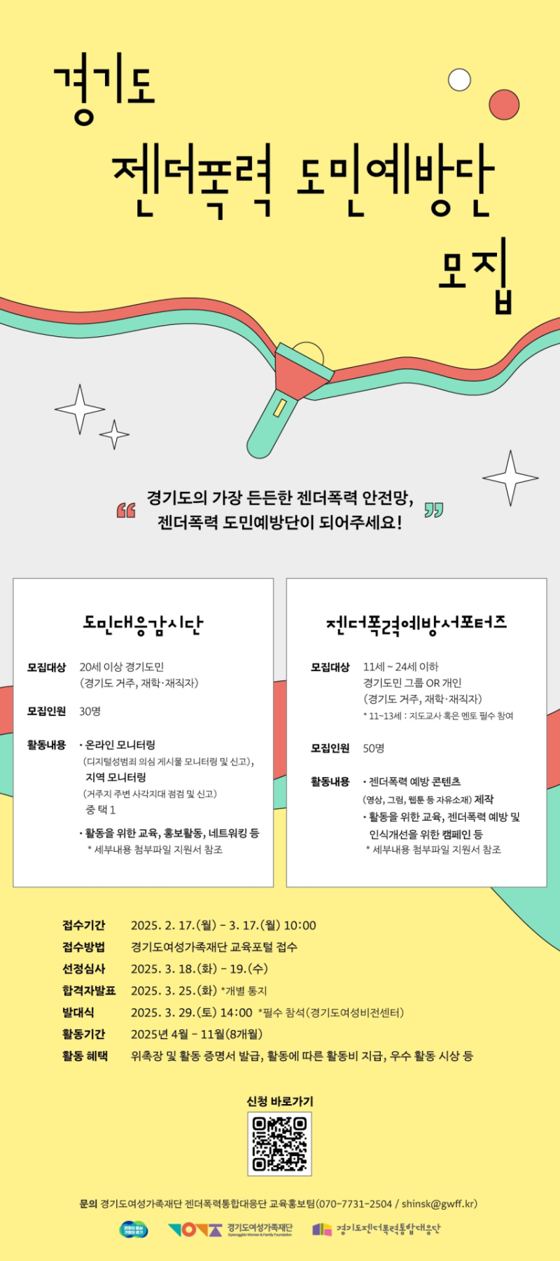 올해는 '도민대응감시단'과 '젠더폭력 예방 서포터즈'를 각각 모집한다. '도민대응감시단'은 20세 이상 경기도민 30명, '젠더폭력 예방 서포터즈'은 11세~24세 이하 경기도민 청소년 50명으로 구성된다.