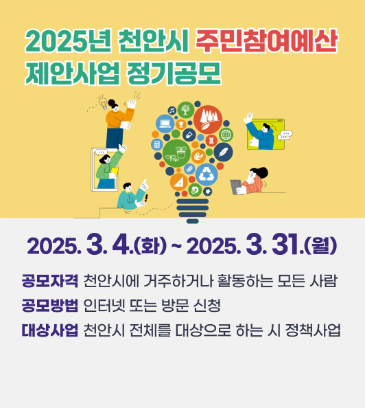 천안시는 오는 31일까지 2026년 예산 반영을 위한 ‘주민참여예산 제안사업공모’를 진행합니다. 주민이 직접 사업을 제안하고, 예산편성 과정까지 참여하는 제도인데요,