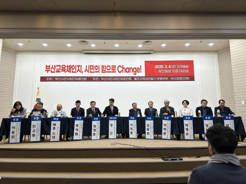 500여 명의 시민들이 참석한 이날 부산교육 대토론회에서 정근 부산시민사회단체총연합 대표회장이 발제와 진행을 맡았고, 학부모·어르신·교육계·종교계·환경단체 등 각 시민단체 대표 10명이 패널로 참석했다.