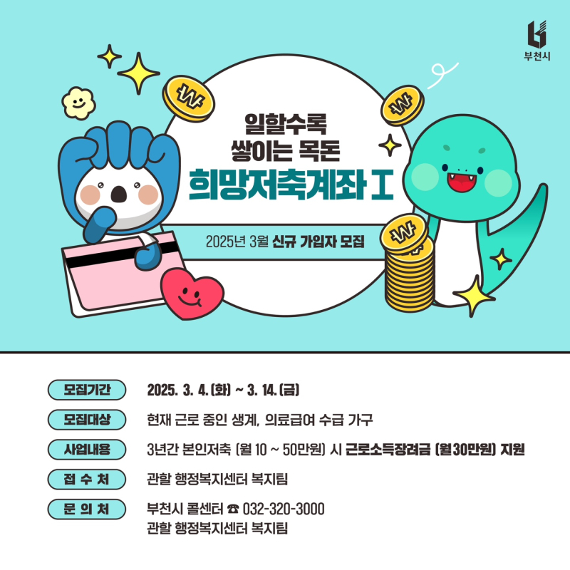 [서울경제TV 인천=김혜준 기자] 부천시 ‘희망저축계좌 I’ 신규 가입자를 모집합니다.