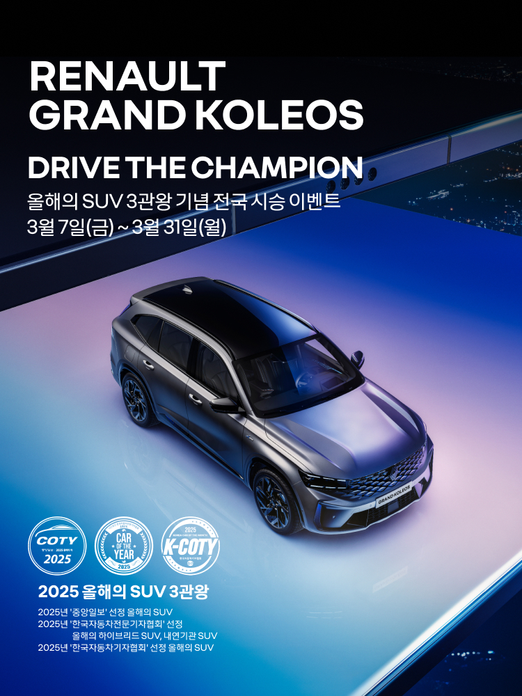 [서울경제TV=진민현 인턴기자] 르노코리아는 ‘올해의 SUV’ 3관왕을 수상한 그랑 콜레오스의 우수한 성능과 특장점을 더욱 많은 고객들이 직접 경험할 수 있도록 ‘드라이브 더 챔피언’ 시승 이벤트를 전국에서 진행한다고 7일 밝혔다.