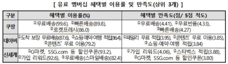 유료 멤버십에서 제공하는 혜택별 이용률을 보면 쿠팡은 무료배송이 99.6%로 가장 높았다. 네이버는 '도착 보장 무료배송'(87.6%), 신세계는 G마켓(지마켓)·SSG닷컴(쓱닷컴) 할인쿠폰(93.2%)을 가장 많이 이용했다.