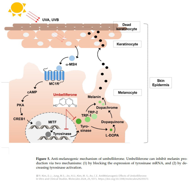 ‘엄벨리페론’은 당근, 고수 등 다양한 식물에서 발견되는 천연 쿠마린 계열의 성분으로 연구소는세포 실험 결과 대조군 대비 멜라닌 생성 및 티로시나제 활성을 유의하게 감소시켰으며, 4주 동안 ‘엄벨리페론’이 함유된 앰플을 피부에 바른 결과, 피부 색소 침착 및 피부 밝기가 유의하게 개선되는 점을 확인했다.