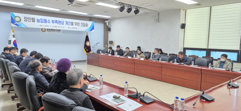 이에 지난 10일 대회의실에서 간담회를 열고, 경제환경위원회 임채덕 위원장, 도시건설위원회 조오순 부위원장, 한국농어촌공사 화성수원지사장, 화성시 건설과장·농업정책과장·장안면장 및 장안면 주민들이 참석해 ▲농업용수 공급 방안 ▲기존 수로 정비 ▲독정리 양수장 설치 등 중장기적인 용수 확보 대책을 논의했습니다.