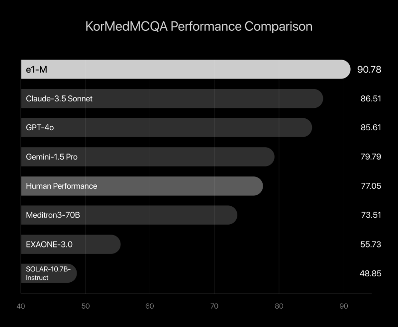 ‘e1-M’은 국내 보건의료인국가시험원(KHPLEI)에서 출제한 의사∙간호사·약사∙치과의사 면허 시험 문제를 기반으로 KAIST 연구팀이 구축한 의료 QA 벤치마크 ‘KorMedMCQA’에서 GPT-4o, Claude 3.5 등 글로벌 AI 모델을 상회하는 결과를 기록했으며, 환자의 증상과 검사 결과를 종합적으로 분석하고 증상 간 연관성을 파악해 치료법을 제시하는 추론 능력에서 우수한 평가를 받았다.