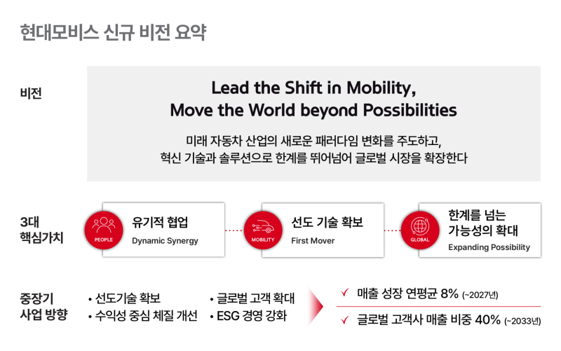 새 비전은 ‘미래 자동차 산업의 새로운 패러다임을 주도하고, 혁신 기술과 솔루션으로 한계를 뛰어넘어 글로벌 시장을 확장한다’는 의미의 ‘Lead the Shift in Mobility, Move the World beyond Possibilities’다.