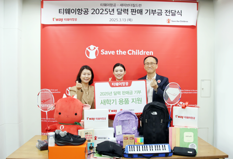 티웨이항공 2025년 달력 판매 기부금 전달식은 지난 13일 오후, 서울 마포구에 위치한 국제아동권리 NGO 세이브더칠드런 본부에서 진행됐다. 2025년 달력 판매금 전액은 국내 교육 사각지대 놓인 아동과 청소년을 위해 새학기 학용품과 생필품 의류 등 필요한 용품 지원 사업에 쓰일 예정이다.