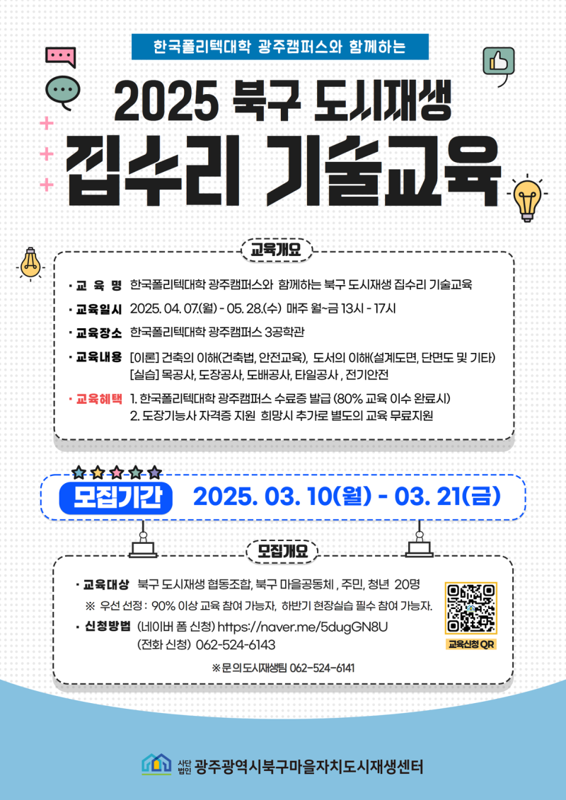 [서울경제TV 광주⋅전남=나윤상 기자] 광주 북구 마을자치도시재생센터가 4월 7일부터 5월 28일까지 한국폴리텍대학 광주캠퍼스와 함께 '2025 북구 도시재생 집수리 기술교육'을 실시한다고 14일 밝혔다.