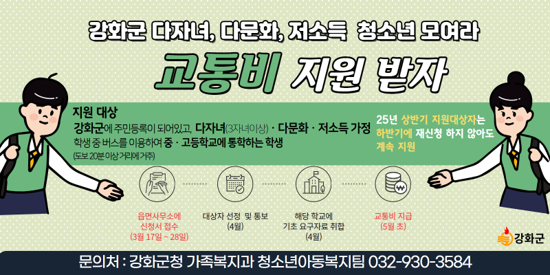 [서울경제TV 인천=김혜준 기자] 인천 강화군이 다자녀, 다문화, 저소득가정의 중·고등학생을 대상으로 교통비 지원사업을 실시합니다.