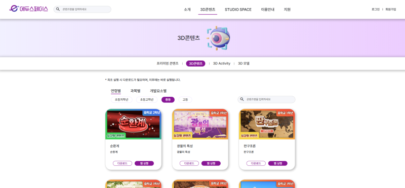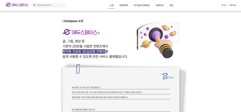 EduSpace는 기존의 2D 콘텐츠 중심 교육에서 한 차원 진보한 3D 실감형 콘텐츠를 누구나 쉽게 활용할 수 있도록 개발된 교육 서비스 플랫폼이다. 인터넷이 접속 가능한 모든 유형의 장비에서 활용 가능하며, 다양한 카테고리의 콘텐츠를 제공해 학습의 접근성을 획기적으로 개선했다.