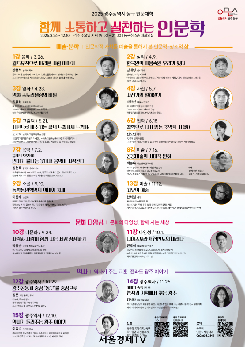 17일 동구에 따르면 함께 소통하고 실천하는 인문학을 주제로 각 분야를 대표하는 명망 있는 강사들을 초청해 진행하는 동구 인문대학을 오는 26일부터 12월 10일까지 격주 수용일(오후 7~9시) 구청 대회의실에서 총 15회 개최한다.올해로 7년을 맞이한 동구 인문대학은 상반기에는 예술 특집강좌, 하반기에는 문화 다양성⋅광주역사 특집 강좌로 나눠 진행된다.