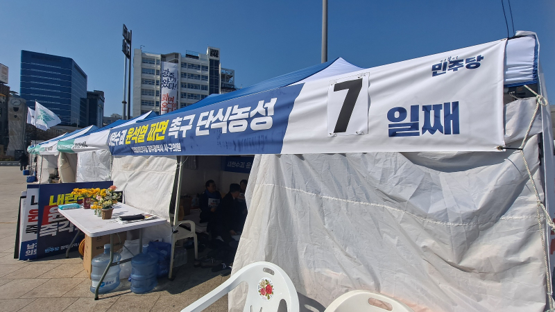 17일 광주 5⋅18민주광장에서 단식 농성을 하는 지방의원들은 모두 한 목소리로 헌재의 빠른 윤 대통령의 탄핵 선고가 나기를 기대했다.