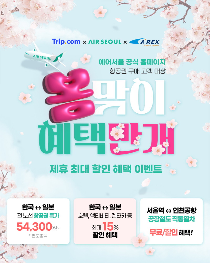 특히 에어서울을 이용하는 일본인 관광객들이 최근 지속적으로 증가하고 있어 공항철도와의 협의를 통해 일본 관광객들에게도 동일한 혜택을 적용하기로 했다. 또한 에어서울에서는 트립닷컴과 제휴해 호텔, 액티비티, 렌터카 등 다양한 여행 관련 상품을 홈페이지 회원과 일본인 관광객 대상으로 할인 제공한다.