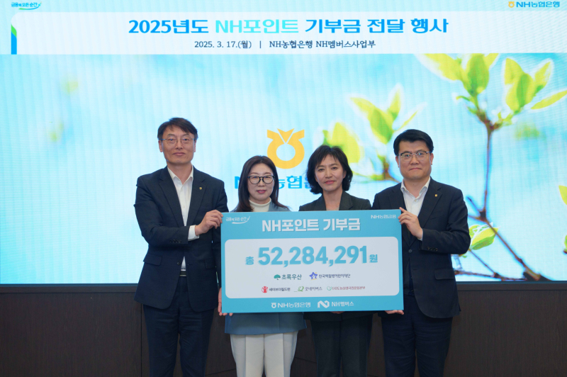 이번 기부금은 지난해 NH멤버스 앱에서 고객들이 자발적으로 기부한 NH포인트로 마련됐다. 총 5228만4291원의 기부금이 초록우산어린이재단, 한국백혈병어린이재단, 세이브더칠드런, 굿네이버스, 도농상생국민운동본부 등 5개 자선단체에 전달됐으며, 취약계층 지원을 위해 사용될 예정이다.