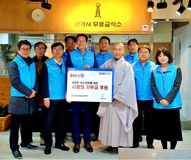 이번 후원금은 지역사회 취약계층을 위한 무료급식 운영에 사용될 예정이다. 후원금 전달식과 배식 봉사에는 원각사 무료급식소 대표 원경 스님, 우리금융에프앤아이 임직원들을 비롯한 자원봉사자들이 함께했다.