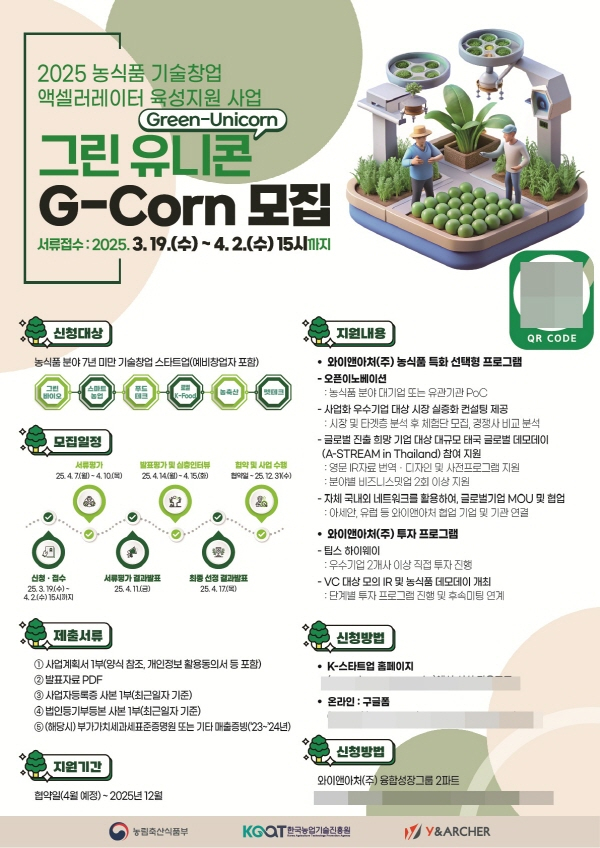 [서울경제TV=김수윤 인턴기자] 글로벌 액셀러레이터 와이앤아처는 농림축산식품부가 주최하고 한국농업기술진흥원이 주관하는 ‘2025 농식품 기술창업 액셀러레이터 육성지원 사업(그린 유니콘 프로그램)’에 참여할 스타트업을 4월 2일 오후 3시까지 모집한다고 20일 밝혔다.