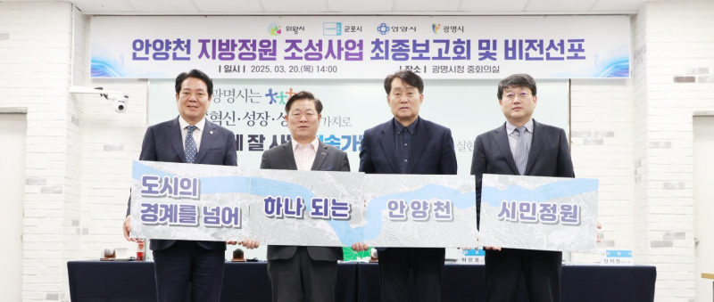 시에 따르면, 경기권 4개 지자체(광명·안양·군포·의왕)가 협력하는 안양천 지방정원 조성사업이 기본 및 실시설계를 마무리하고 본격적인 실행 단계에 돌입했습니다. 20일 광명시청에서 열린 최종보고회에서 박승원 광명시장, 최대호 안양시장, 하은호 군포시장, 안치권 의왕 부시장 등 관계자들이 참석해 설계안을 검토하고 추진 계획을 논의했습니다.