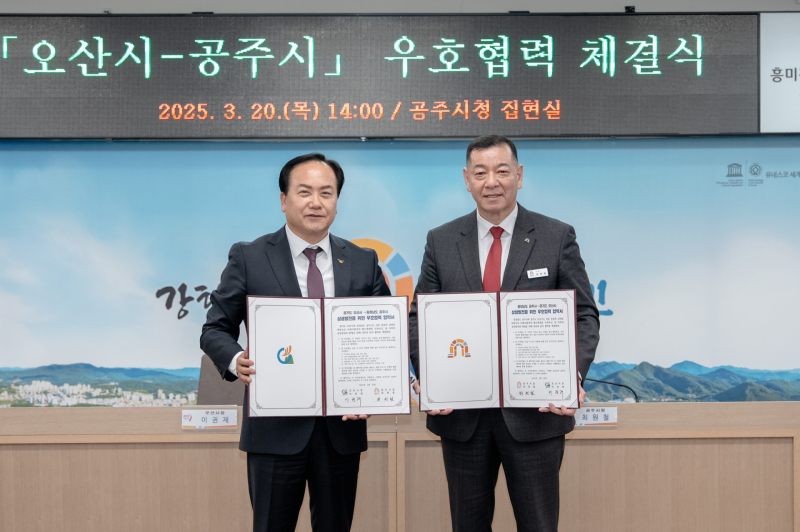 20일 시에 따르면, 공주시청 집현실에서 열린 협약식에는 이권재 오산시장, 최원철 공주시장을 비롯해 양 도시 관계자 및 민간단체 관계자 등 50여 명이 참석했습니다. 양 도시는 백제의 역사적 유산을 공유하는 공감대를 바탕으로 문화·관광·경제 등 다양한 분야에서 협력을 확대하기로 했습니다.
