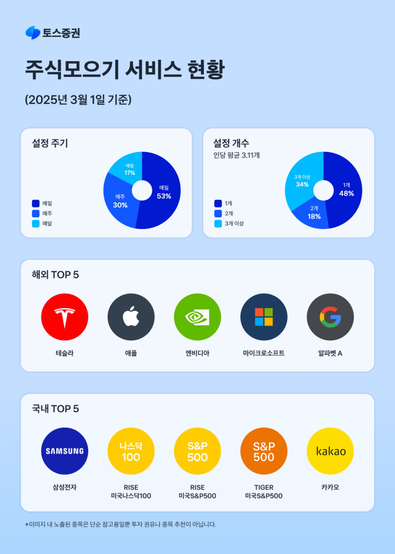 토스증권은 고객 한 명당 평균 3건 이상의 주식모으기를 활용하고 있다고 밝혔다. 투자 주기별로는 ‘매일’ 꾸준히 투자하는 비율이 53%로 가장 높았으며, ‘매주’ 투자하는 이용자가 30%, ‘매월’ 투자하는 이용자가 17% 순으로 조사됐다.