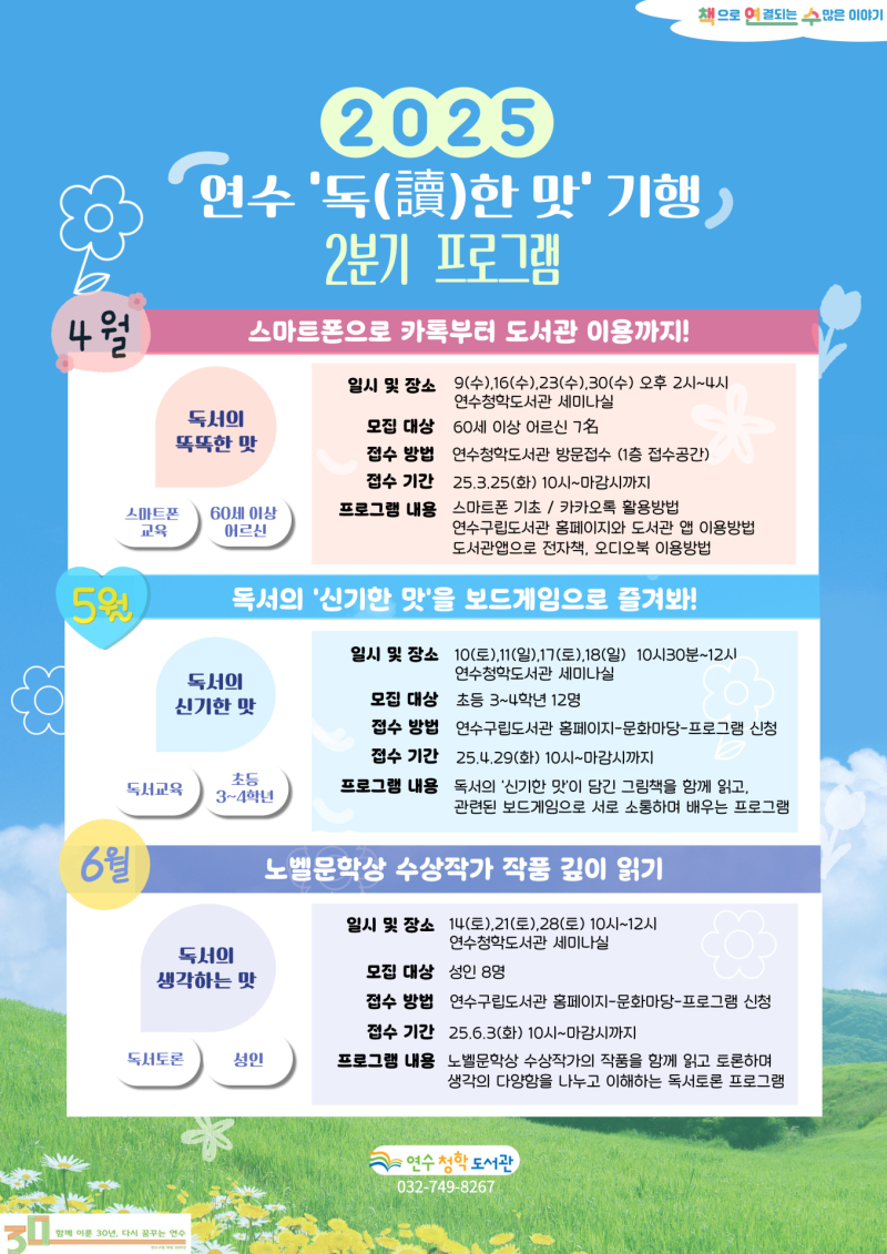 [서울경제TV 인천=김혜준 기자] 인천 연수청학도서관이 ‘2025 연수 독(讀)한 맛 기행’ 2분기 프로그램을 운영합니다.