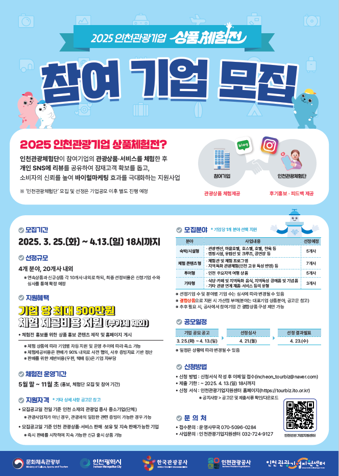 [서울경제TV 인천=김혜준 기자] 인천시와 인천관광공사가 ‘2025 인천관광기업 상품체험전’ 참여기업을 모집합니다.